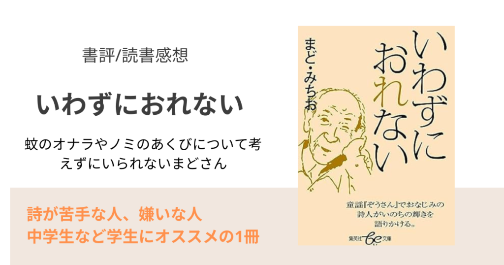 蚊のオナラやノミのあくびについて考えずにいられないまどさん 今日紹介する本は「いわずにおれない」 ジャンルはインタビュー・詩集 になります。「ぞうさん」「やぎさんゆうびん」など誰でも生きている中で一度は必ず聞くであろう詩・童謡を作られている詩人「まどみちお」さんへのインタビューとその関連した詩が収められた一冊となっています。 -