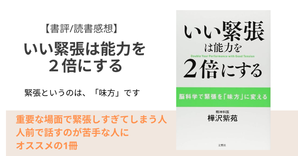 緊張というのは、「味方」です。今日紹介する本は「いい緊張は能力を2倍にする」。ジャンルは自己啓発 になります。本書は精神科医や作家として活躍する筆者が、精神医学や脳科学、心理学の研究結果や自身の経験を通じて、「緊張を克服するため」の自己啓発本になります。